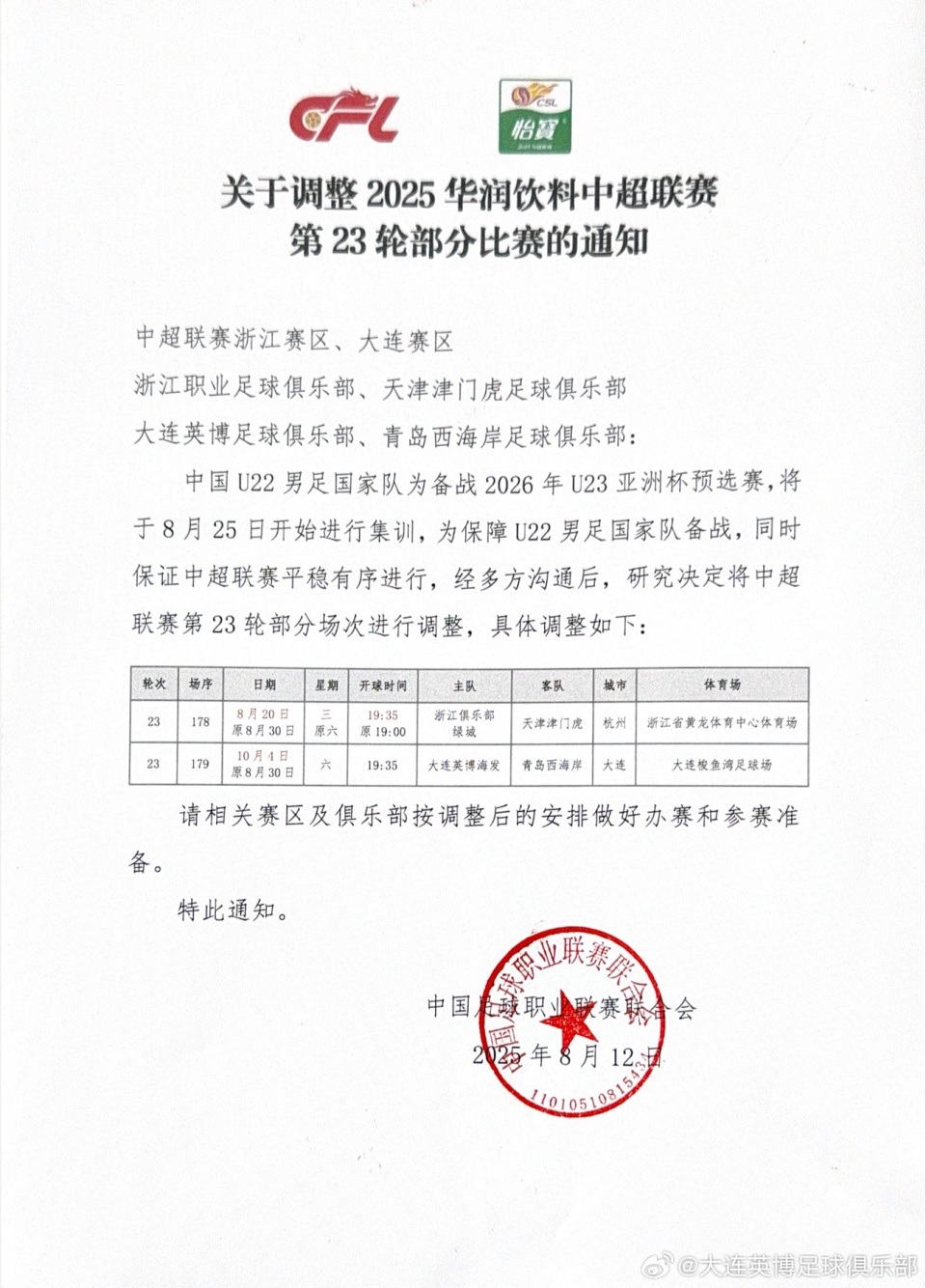 北京时间8月12日,根据大连英博官方发布的文件显示,中足联发布通知称,为保障U22男足备战,中超第23轮浙江vs津门虎比赛提前至8月20日进行。