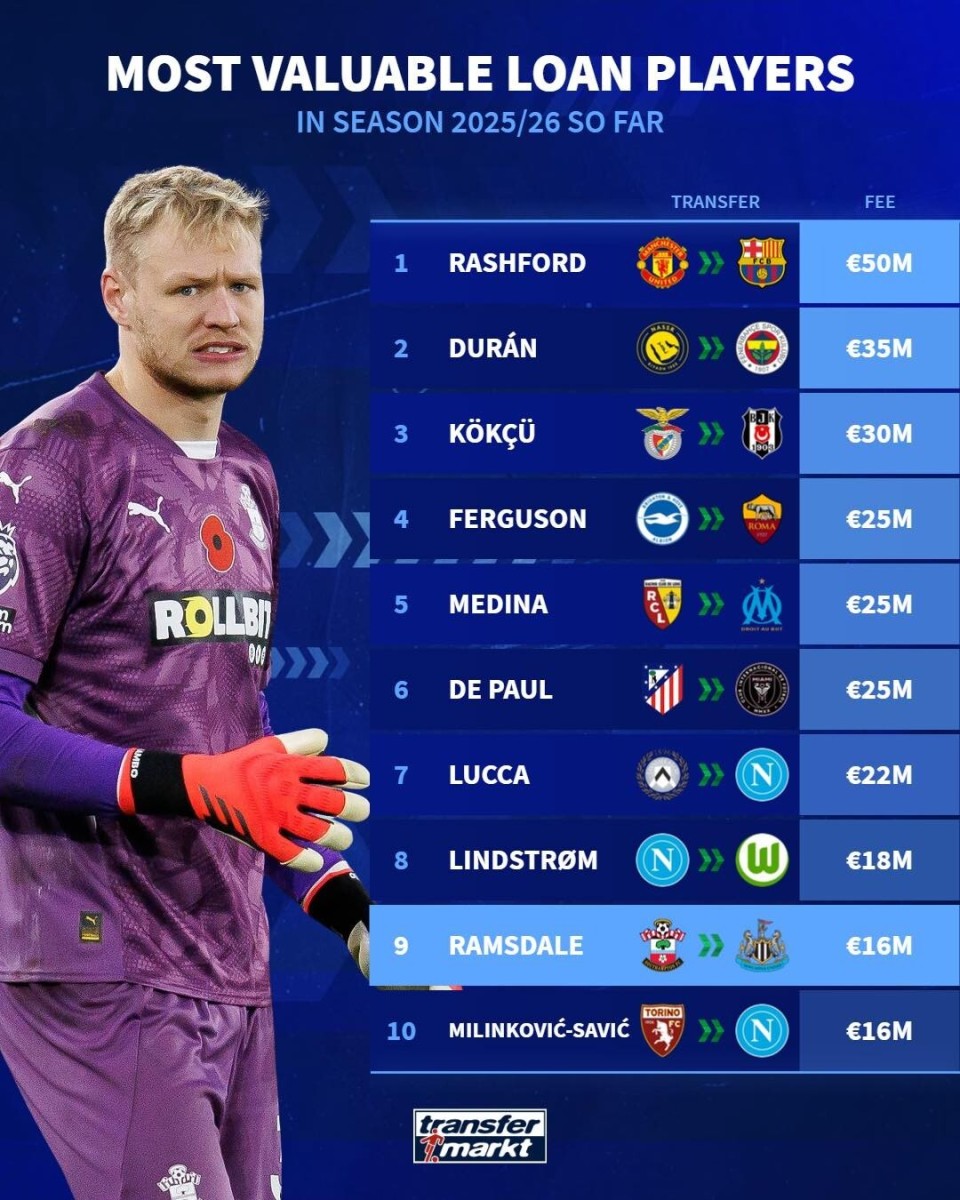 德国转会市场列出了今年夏窗租借球员身价榜TOP10。拉什福德以5000万欧的身价高居榜首,从南安普顿租借加盟纽卡斯尔联的门将拉姆斯代尔以1600万欧位列第九。